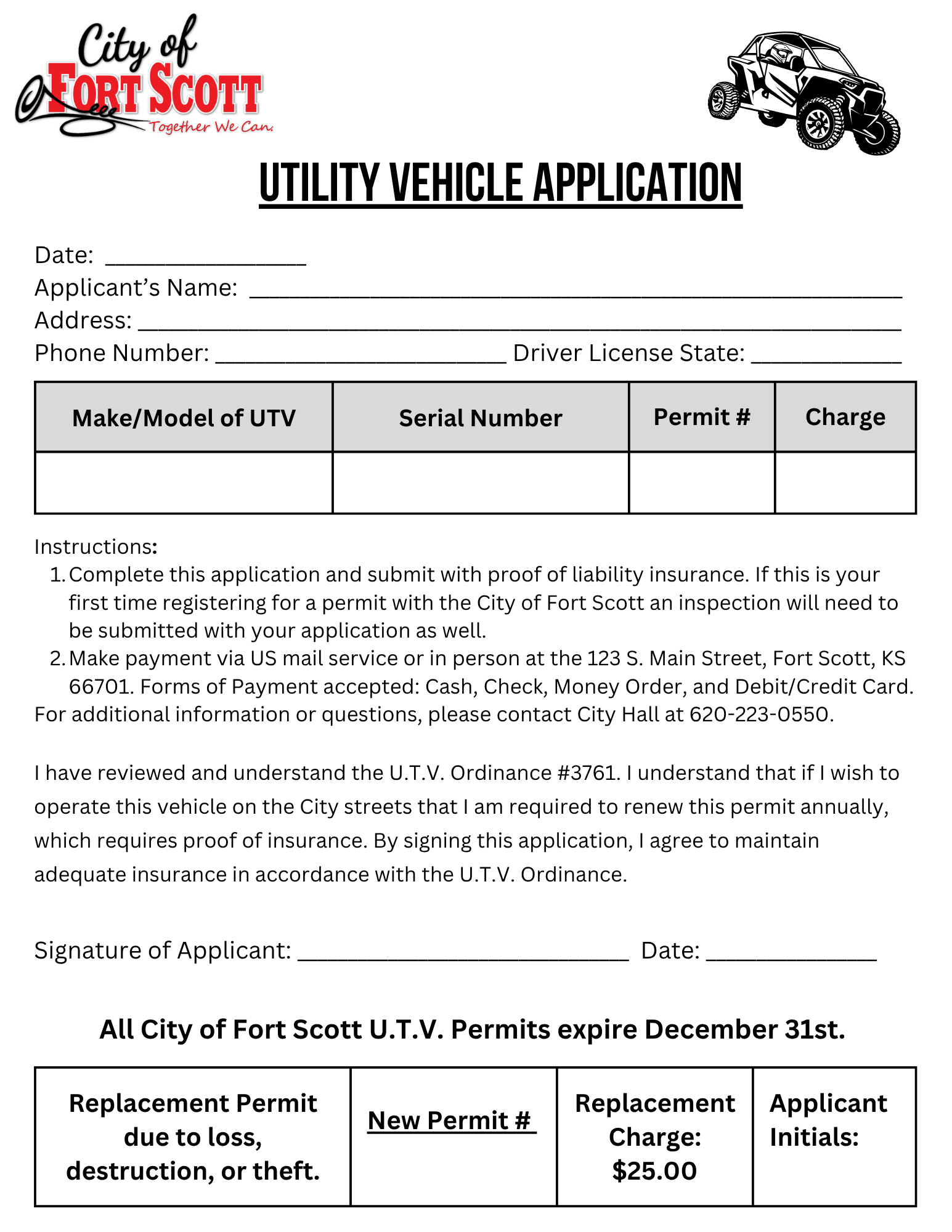 Official InspectionOfficial inspection WILL be required if the vehicle has never been licensed with the City or upon transfer of ownership. Official inspection is NOT required if you have previously obtained a license through the City for said vehicle. Proof of InsuranceProof of insurance must be provided each year. ApplicationA UTV License Application must be completed each year.