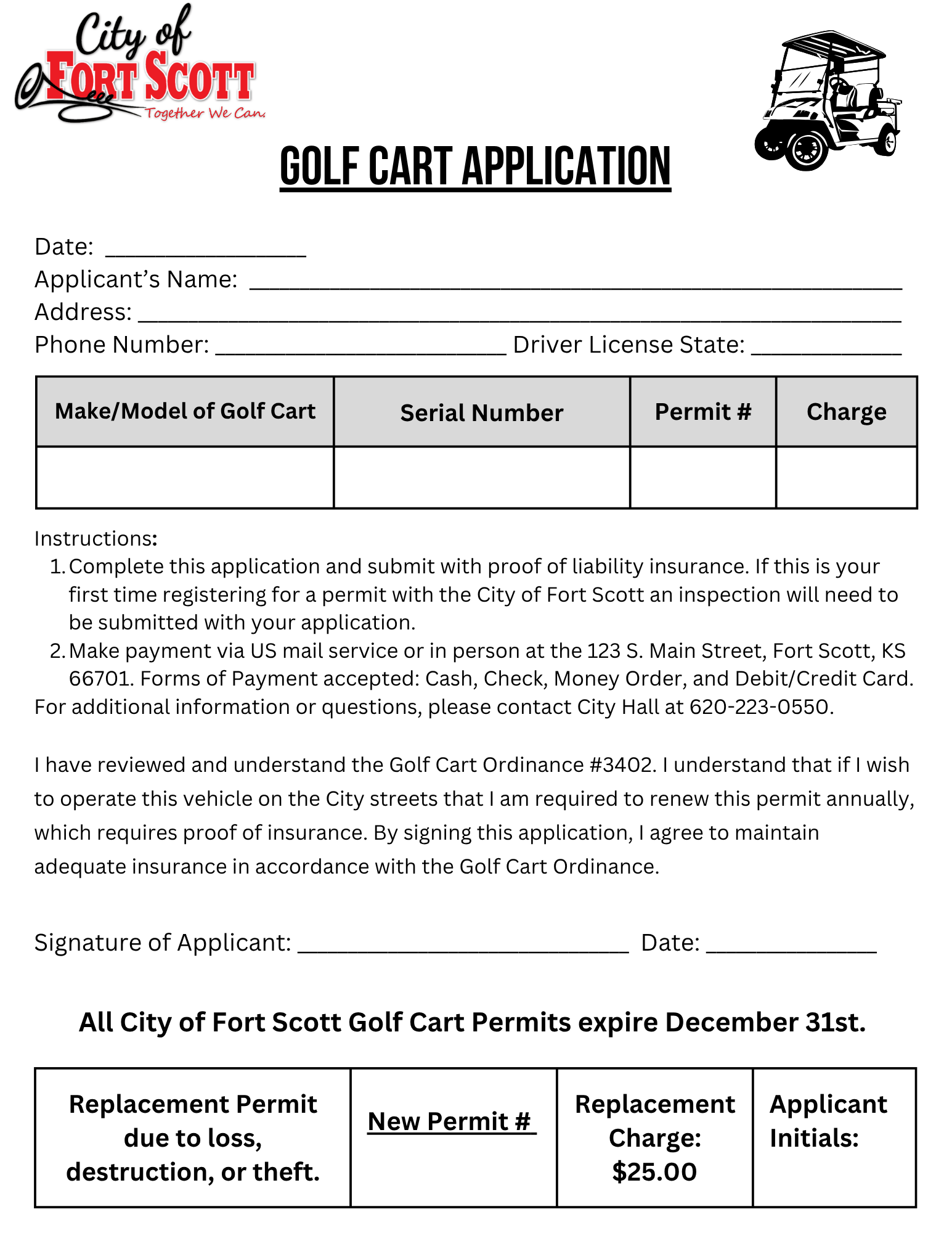 Proof of InsuranceProof of insurance must be provided each year. ApplicationA Golf Cart License Application must be completed each year.