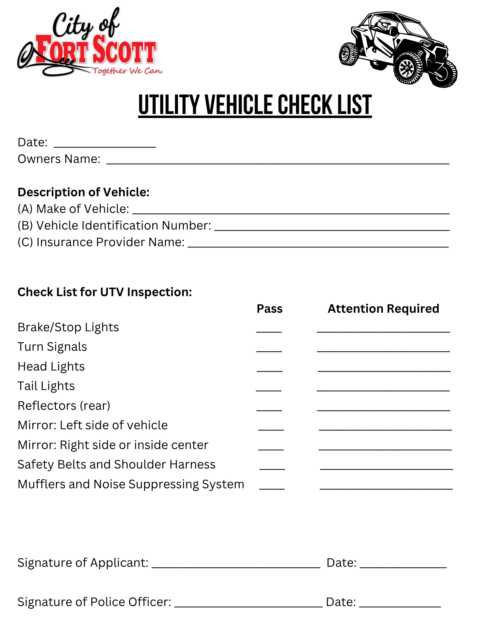 Official InspectionOfficial inspection WILL be required if the vehicle has never been licensed with the City or upon transfer of ownership. Official inspection is NOT required if you have previously obtained a license through the City for said vehicle. Proof of InsuranceProof of insurance must be provided each year. ApplicationA UTV License Application must be completed each year.